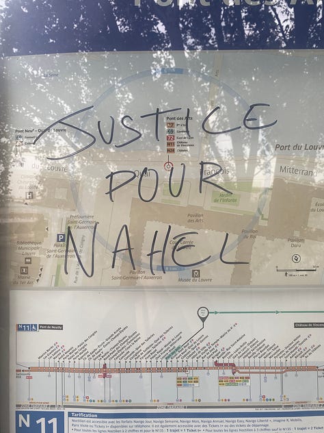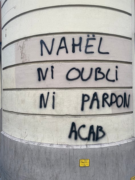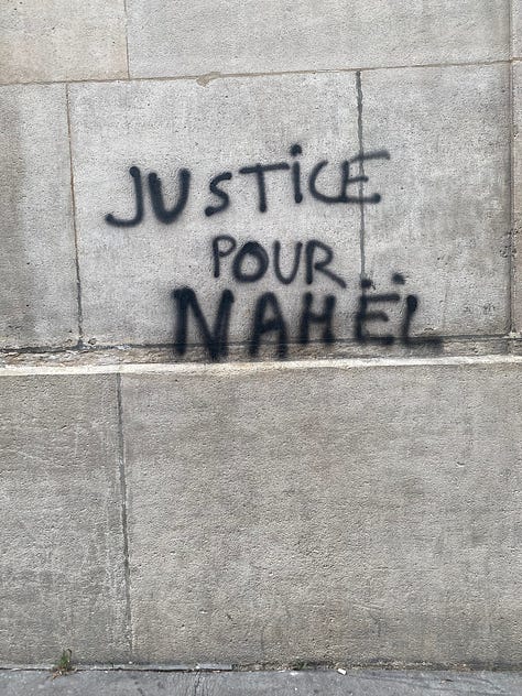 My mother came to meet me in Paris, and we stayed for an additional two days after the workshop. As we walked around the city and I processed my observations from the previous days, the police presence was forceful, intimidating, lingering. I noticed several tags sprayed on walls, written on bus stops, slicks of black, hurried, handmade fonts calling out ‘justice pour Nahel’. They had sprung up overnight, precursors to the protests that spread across France that summer; an eruption of years of latent anger against police brutality and racism.